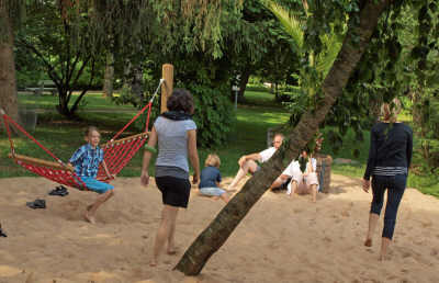 Einer der Höhepunkte des Rundgangs ist das große Labyrinth mit vielen verschiedenen Bodenbelägen. Es lädt zu längerem Aufenthalt ein, bevor sich der weitere Verlauf des Wegs wieder dem Ausgangspunkt nähert. Doch bis man diesen erreicht, passiert man noch andere Orte, an denen sich das Verweilen lohnt: Vogelvolieren, ein Sandstrand mit Palme und Hängematte, ein Teepavillion, der Heilkräuter- und der Duftgarten.
