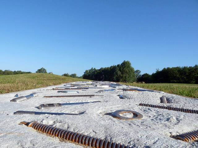 Mit einem Sprung landen die Besucher dann in die Welt der landwirtschaftlich genutzten Natur. Ein Weg der Feldfrüchte schlängelt sich unter ihren Füßen, Flachs, Gerste, Weizen... Dann ist es nur ein Schritt von der Landwirtschaft zur Industrie von Armentière. Die Wanderer laufen über Beton, Ziegel, Kohle, Glas ...