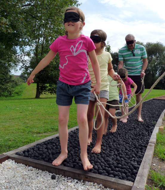 Schließlich kehren sie zurück in die Natur und die Blumen, Pflanzen, Grashalme .... und sogar Schlamm. Nach der Erkundung dieser neuen Horizonte können sie die Füße waschen und in der Sonne trocknen.